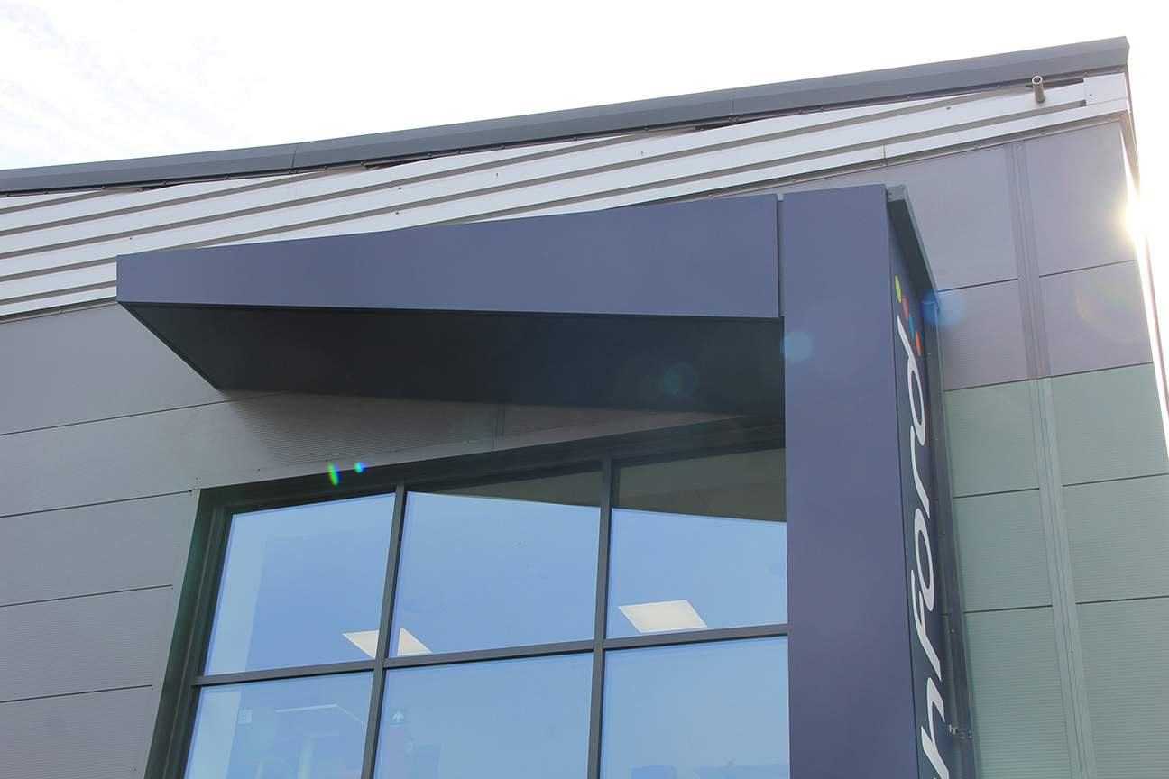 Valcan Vitradual A1 Aluminium panels were specified for the canopy cladding, forming a robust and durable solution suitable for a prominent external application. The panels were integrated into a fully detailed façade build‑up, incorporating VitraFix support rails and fixings to accommodate the cantilevered canopy geometry and ensure long‑term structural performance.
